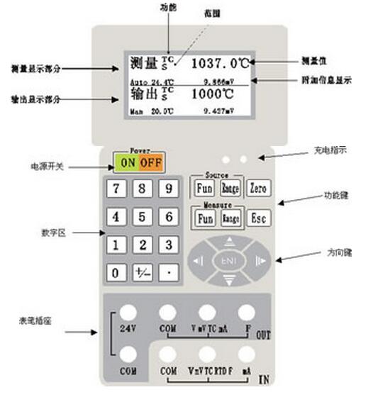 当电池电量耗尽的时候(屏幕闪动或者按开机键无法开机),把充电器由此口插入进行充电,充电时候可同时进行测量或者输出,
