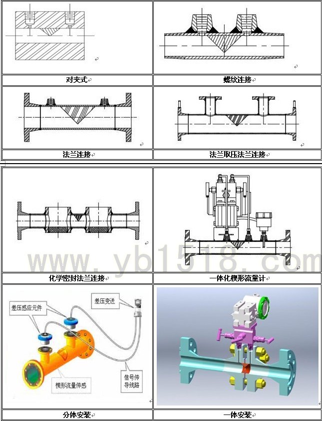 楔形流量计按其组装方式分为一体型和分离型,按其连接方式分为法兰连接、焊接连接、螺纹连接及对夹式连接,按其取压方式分为普通取压、法兰密封取压等结构。详见下表: