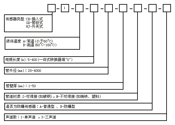 例如:选型外夹式单声道传感器,液体常温,电缆长度15m,管外径325mm,壁厚10mm,管道材 质为钢,非防爆。选型编码为:WJ-1-A-15-325-10-S-A-1