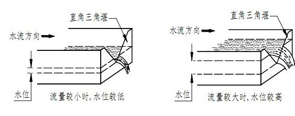 流通顺畅的明渠内流量越大,液位越高;流量越小,液位越低(如下图)。通过测量水位可以反算出流量。普通明渠内流量与水位之间的对应关系,受渠道的坡降比和表面的糙度影响。在渠道内安装量水堰槽,产生节流作用,使明渠内的流量与液位有固定的对应关系,这种对应关系主要取决于量水堰槽的构造尺寸,渠道的影响减小至最小