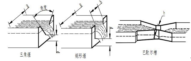 常用的量水堰槽有,直角三角堰、矩形堰和巴歇尔槽(如下图)