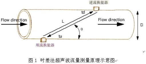 图1中有两个超声波换能器:顺流换能器和逆流换能器,两只换能器分别安装在流体管线的两侧并相距一定距离,管线的内直径为D,超声波行走的路径长度为L,超声波顺流速度为tu,逆流速度为td,超声波的传播方向与流体的流动方向加角为θ。由于流体流动的原因,是超声波顺流传播L长度的距离所用的时间比逆流传播所用的时间短,其时间差可用下式表示: