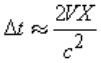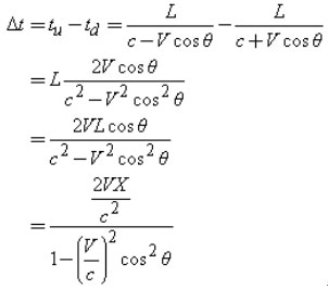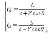 其中:c是超声波在非流动介质中的声速,V是流体介质的流动速度,tu和td之间的差为