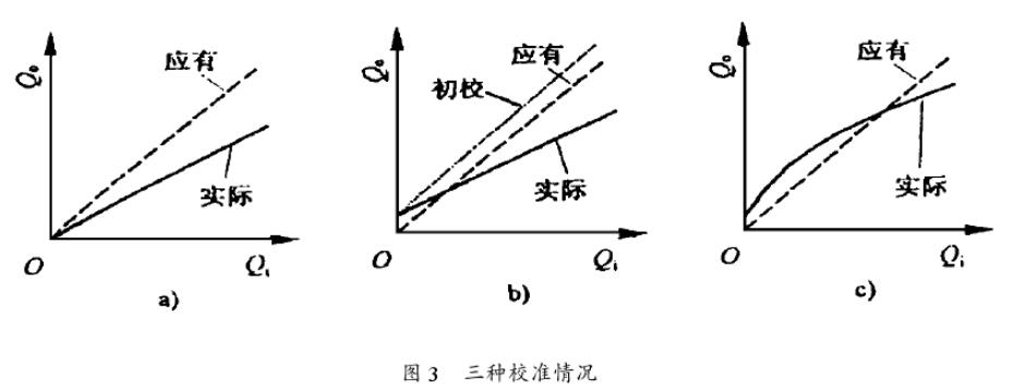 单点校淮法一般在午夜成人小视频仅存在灵敏度误差时采用,如图3a所示为流量计实际灵敏度小于应有受敏度的情况,Qi为已知流量,Qo为被校准午夜成人小视频的读数,流量计的测量范围为FS=Qmin-Qnax,在校准时,首先给定Q=Qa(应注意满足0.2FS<Qn<0.8Fs),同时读得Qo=Qo1,可算出灵敏度校正系数为K1=Qa/Qa1,然后将K1纳入流量计的倍参数或仪表系数即可。