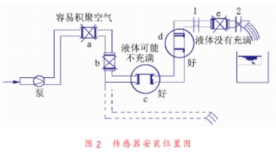 在电磁流量计运行过程中,必须保证仅表内测量流体流动方向正确,一般应与売体上箭头方向相同。事实上也有一些电磁流量计具备正反两相测量的功能,将其设置中的“反向测量允许”状态设置为“允许”状态即可2。流体介质未充满整个管道的主要原因往往是測量管网或传感器安装位置没有符合设计安装要求。传感器的安装位置示意见图2。如若将传感器安装至a、e位置,因为位置较高容易导致气泡聚集;安装在b位置时则容易导致液体不满管,正确安装位置应为c、d位置处。