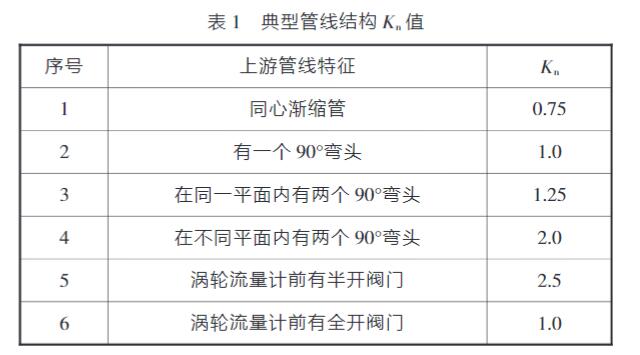 式中:μ为管道内摩擦因数;Kn为漩涡速度比,由涡轮流量计上游管线特征确定。表1为典型管线结构的Kn值。
