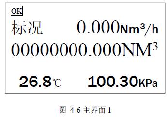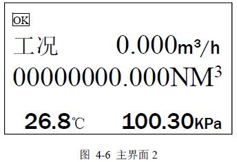 可以显示当前标况瞬时流量(Nm3/h),标况累积总量(Nm3),流体介质温度(℃),取压口压力(KPa),当前系统状态是否正常工作以及电池电量.按F3键会进入主界面2.如图4-6。