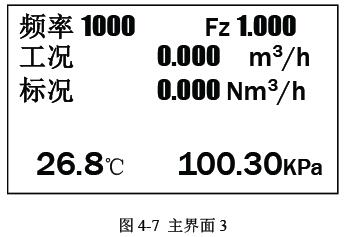 可以显示当前频率(Hz)、超压缩因子、工况瞬时流量(m3/h)、标况瞬时流量(Nm3/h)、流体介质温度(℃)以及取压口压力(KPa)。按F3 键会进入主界面1。如图4-7。