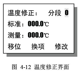 2、温度校准设置.温度传感器Pt100 的校准系数设置,对温度修正共分5 段(0~4).通过标准电阻箱和Pt100 分度表,按照从小到大的顺序将标准温度和测量温度依次输入,之后进行修正.菜单设置界面如图4-12(后续菜单诸如此类,不一一展示).