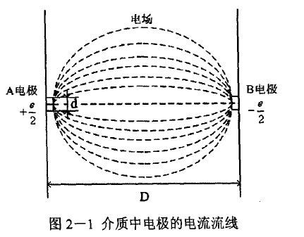 对于点电极的电磁流量计流量信号内阻来说,如图2-1所示,在绝缘衬里的传感器测量管内壁,装有一对接液电极.电极是圆盘状,直径为d,电极A和电极B 的距离(测量管直径)为D(d<<D)。充满导电液体的管道足够长,电极所处介质的电导率s和介电常数e是均质的,对介质内的电流场不致有所改变。在这些假定条件下,电极实际上等于埋在各个方向具有无限深层的介质内。设两电极间的电动势为e,A电极的电位为+e/2, B电极的电位为-e/2。从图2-1可以看出,电流由A电极向介质散流汇集于B电极流出。电流流动时流过的截面在电极附近最小,以后离电极愈远愈大。也就是说离电极愈远电流密度愈小,因而电场强度也愈小。由此可见,在电流经过的途径每单位长度上,介质对电流的电阻愈远愈小.这样,在计算传感器信号内阻时,可以暂把流体的体电阻视为零,仅计算两电极与介质相接触的接触电阻。为了计算方便,先把电极作为球体看待,设球体的半径为r.一个带电球体的电容c是: