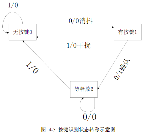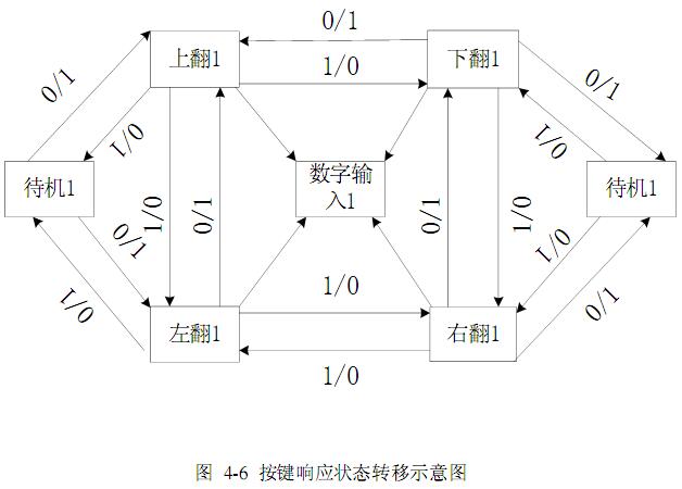 ⑴按键识别响应,分为两部分,一部分是最底层的按键状态识别的转换,另一部分是根据键值进行液晶显示控制的状态转换,如图4-6、4-7所示。对于上、下、左、右翻页,由于点阵液晶菜单显示,还会划分许多状态,这是下一层次的状态转换,将会在液晶显示模块中进行详细介绍。