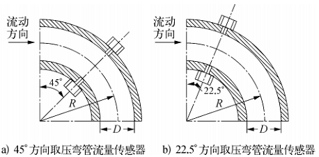 当弯管传感器的几何尺寸确定之后,只要测取弯管45°(或22.5°)截面的内外侧压差Δp和流体的密度ρ就可以确定流体的平均流速,进而计算出工况流量和标况流量。