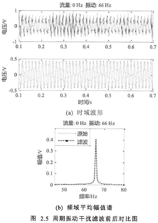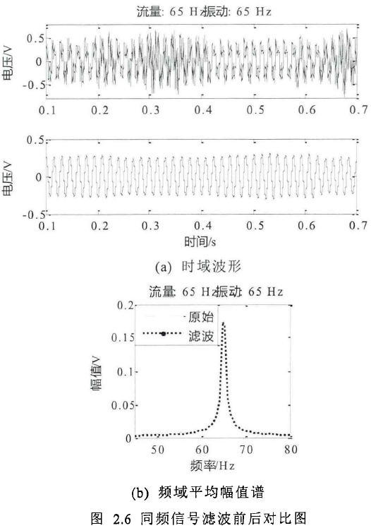 用上述相同准则设计滤波器。约为65Hz的同频信号滤波前后的时域波形对比如图2.6(a)所示,滤波前后的频域平均幅值谱对比如图2.6(b)所示.
