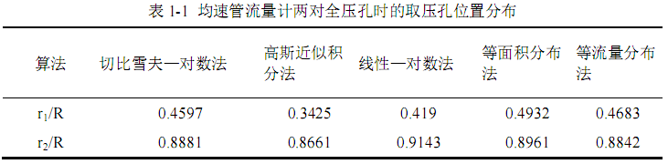 阿牛巴流量计是一种多点采样的流量计,开孔数量与位置的确定通常用数值逼近法和流速分布确定。目前采用的方法大致有5种:等面积分布法、高斯近似积分法、等流量分布法、线性—对数法,切比雪夫—对数法。此五种方法都是通过测直径上几个点的流速来获取整个截面的流速分布。表1-1给出了五种方法计算得到的取压孔位置。