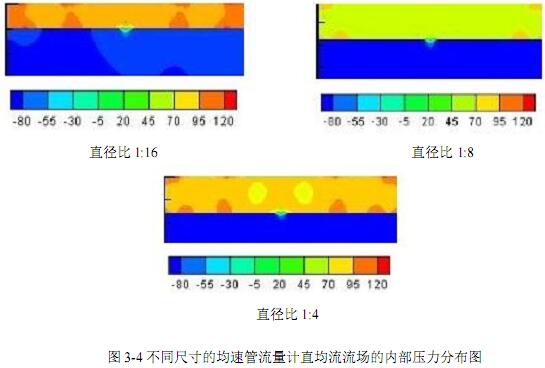 为确定不同因子对阿牛巴流量计测量精度的影响,模拟仿真了不同直径比的阿牛巴流量计直均流时的测量特性。查DN100被测管道的阿牛巴流量计开孔直径为2mm,内腔直径为16mm,直径比为1:8。本文设计直径比为1:16、1:8、1:4三种尺寸的阿牛巴流量计。三支阿牛巴流量计上方矩形进气槽进口速度为10m/s,仿真得到各阿牛巴流量计的内部压力分布云图如图3-4所示。