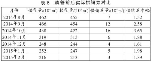 2014年8—10月期间,下游公司发现正供销差持续增大时,对A分输站和B分输站的涡轮流量计进行了标定,但标定结果均为合格。随后下游公司在2014年11月5—7日对A至B分输站段管线进行了清管作业,共清出污水杂质约23t,清管完成后正供销差明显减小。清管前后实际供销差数据如表6所示。