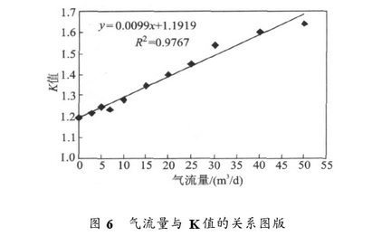 保持气量不变,取水相流量10m³/d及以上时的数据,计算涡轮流量计响应与水流量关系直线的斜率(即K值),然后做出气流量与K值的关系图版如图6所示5随着气相流量的增加,K值近似呈线性增加。