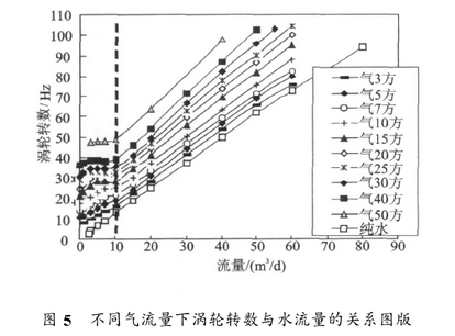 本实验考察流量计在动水中(水相流量不为零)对气相流量的响应规律。实验中,气体流量依次保持为.3,5,7,10,15,20,30,40,50m³/d,对于每一个气相流量,水流量依次按60,50,40,30,20,15,10,7,5,3,1m³/d的递次调节,稳定后记录涡轮转速。获得的两支涡轮流量计在气/水两相流中的涡轮响应规律一致。其中1#流量计在气/水两相流中的响应,如图5所示。涡轮在低液量和高流量时有不同的规律,在水流.量高于10m³/d时,保持气量不变,涡轮响应与水流量呈线性关系,但在较高的气量下具有较高的斜率,或较大的仪表常数。而在在低液量下,即在水流量低于10m³/d时,涡轮响应与水相流量呈非线性关系。此时,随着水流量的增加,涡轮响应也增加,但较纯水时的响;应增加缓慢,而且随着气量的增加,涡轮响应对液相的敏感性越差,当气量达到20m³/d时,几乎呈一个平的.台阶,说明此时涡轮对液相流量失去了分辨能力,表明涡轮流量计在高气相流量时不适合用来测量低液量液相的流量。