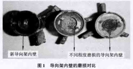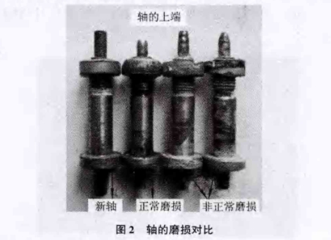由图1可看出非正常磨损的导向架与新导向架内壁的差异。这是轴偏离水平线与导向架直接作用的结果;由图2可看出轴的磨损情况,正常磨损的轴其前后端大小变化不大,只是长短有变化,而非正常磨损的轴因过度磨损而呈现锥形。