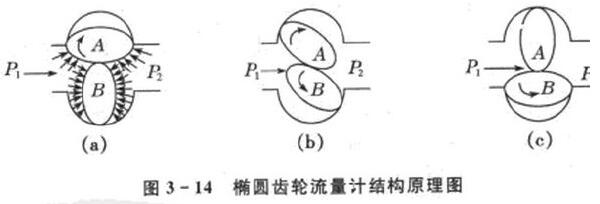 椭圆齿轮流量计的测量部分是由两个互相啮合的椭圆形齿轮A和B以及轴、壳体等组成。椭圆齿轮与壳体之间形成测量室。如图3-14所示。
