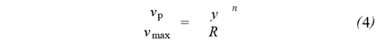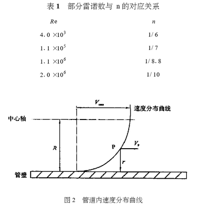 式中:vp为到管壁距离为y的P点的速度;y为点到管壁处的距离;Vmax:为管道中的最大流速,通常取管道中心的速度;R为管道的半径;n为雷诺数的函数。