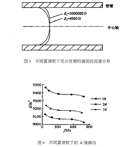 图3给出了不同雷诺数下充分发展的湍流的流速分布,如图所示Re越大,流速分布越平滑,即旋涡发生体附近的流速越接近平均流速,故ƒ( Re)应为单调递减函数。图4给出了3台50mm口径,宽度14 mm三角形旋涡发生体的气体涡衔流量计,在20℃,一个标准大气压下,不同雷诺数下的K值曲线。如图所示实验数据与理论分析基本一致,因此涡衔流量计的测量原理即决定了仪表系数的非线性特性。若要提高午夜成人小视频的计量精度,必须针对不同的流速分布对K值进行修正。