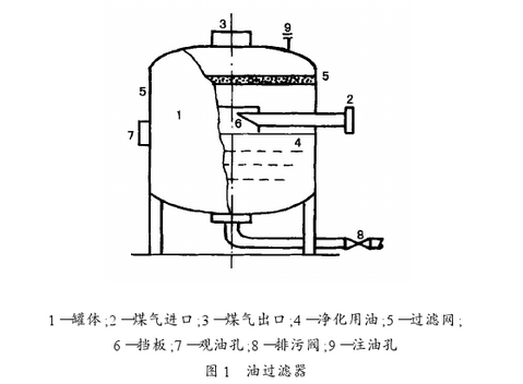 2)加装油过滤器(见图1)。其工作原理:当气体进入罐体后经挡板进入净化用油中,人工煤气中的煤焦油灰尘萘硫化物等杂质溶于油中,从油中返上的气体经不锈钢过滤器后进入流量计。加装油过滤器后计量表不但运行稳定,而且保持精度。1997年在装有涡轮流量计的600余户的调压站,安装一台油过滤器2台德莱塞表,经过近5个月的对比实验,效果良好,仪表运行稳定,没有发生过任何
