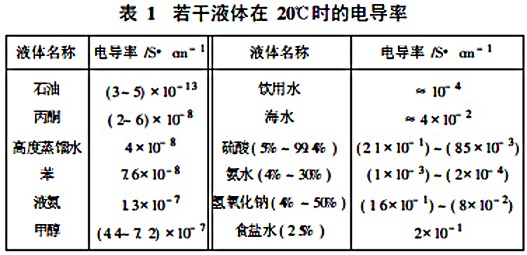 工业用水及其水溶液的电导率大于10-4S/cm,酸、碱、盐液的电导率在10-410-1S/cm之间,使用不存在问题, 低度蒸馏水为10-5S/cm 也不存在问题。石油制品和有机溶剂电导率过低就不能使用。表1列出若干液体的电导率。从资料上查到有些纯液或水溶液电导率较低,认为不能使用,然而电磁流量计实际工作中会遇到因含有杂质而能使用的实例,这类杂质对增加电导率有利。对于水溶液,资料中的电导率是用纯水配比在实验室测得的,实际使用的水溶液可能用工业用水配比,电导率将比查得的要高,也有利于流量测量。