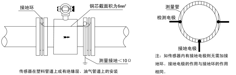 可靠的工作,提高测量精度,不受外界寄生电势的干扰,传感器应有良好的单独接地线,接地电阻<10Ω.在连接传感器的管道内若涂有绝缘层或是非金属管道时,传感器两侧还应加装接地环.