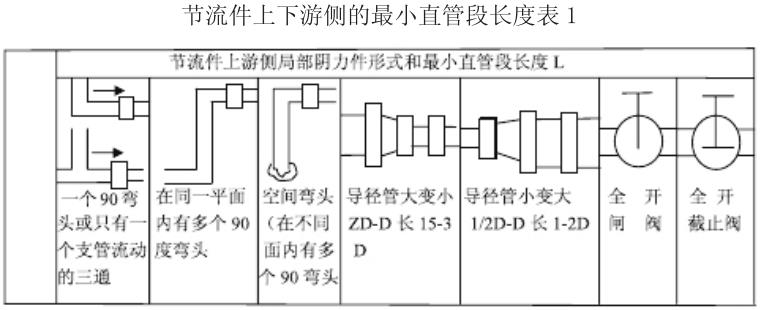 ②节流件前后要求一段足够长的直管段,这段足够长的直管段和节流件前的局部阻力件形式有关和直径比β有关,见表1(β=d/D,d为孔板开孔直径,D 为管道内径)。