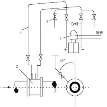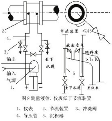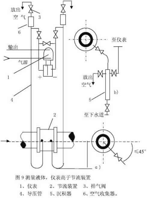 测量介质为清洁的气体流量时,安装方式一般为差压变送器高于,低于节流装置两种c如图11.12)取压口位置应符合上述安装要求,当差压变送器低于节流装置时,导压管必须向下弯至差压变送器,并在最低处装置放水阀和沉积器。
