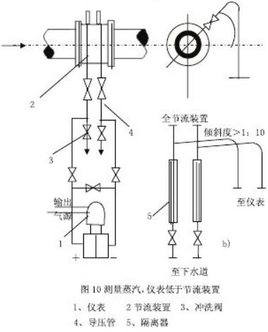 测量蒸汽流量时,安装方式一般为差压变送器低于,高于节流装置两种.(如图 12)取压口位置应附合上述安装要求,并在导压管制高点处装上放气阀和气体收集器。