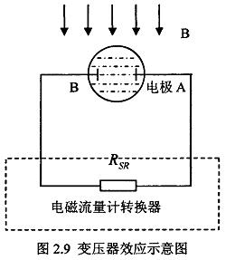 传感器两电极、被测液体、放大器内阻构成一个闭合回路如下图2.9,这相当与一个一匝的变压器次级绕组,励磁线圈相当与初级线圈,闭合回路相当与次级线圈。由于闭合回路不可能完全平行与磁场,总有部分磁力线穿过,这样即使流速为零,也会产生感应电压,这就是“变压器效应"。