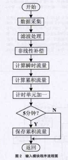 输入模块主要包括数据采集、滤波、温度补偿、非线性补偿和数值计算等,总体采用定时器中断方式,程序流程图如图2所示。输入模块中的非线性补偿程序采用分段线性拟合的方式来实现。通过采集9组或11组流量信号,作为拟合直线的端点,当前采样值按数据大小得到拟合曲线段的斜率和初始数据,代入拟合方程即可得到修正后的流量数据。