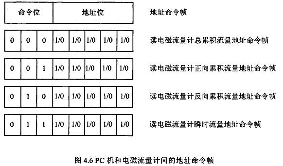 在电磁流量计等节点设备和PC机通信的过程中,由地址帧、命令帧、数据帧、校验和可组成各种功能不同的报文.由于采用主从工作方式来实现通信,电磁流量计等节点设备仅能接收并执行PC机发送来的控制命令,而不能发送命令给PC机.因此,由PC机发往流量计等节点设备的报文一般包括一个地址帧,一个命令帧,若干个数据帧和一个校验和,其报文格式如图4.5a所示:而由流量计等节点设备发往PC机的报文一般包括一个地址帧,若干个数据帧和一个校验和,其报文格式如图4.5b所示.