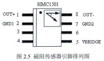 金属管浮子流量计中磁阻传感器HMC1501是设计中的主要器件,使用HMC1501传感器避免了接触式角位移传感器因磨损而发生的信号丢失的现象,而且具有高分辨率,低功耗,体积小的优点,分辨率可达到0.07度,测量范围为±45°。对磁铁的温度系数不敏感,对于冲击和振动不敏感,以及可以承受传感器和磁铁之间间隙较大的变化。它的引脚排列如图2.5所示: