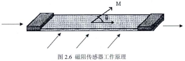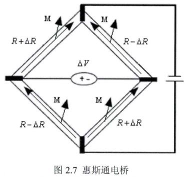 图2.7为四个相同磁阻构成的惠斯通电桥,当无外加磁场时V+=V-,则输出量AV=0。当有磁场作用时,M与I方向的夹角发生变化,这时,磁阻阻值就会发生相应的变化,此时,一对阻值增加,一对减小,通过磁阻的电流发生变化,从而在输出端形成差分电压△V。