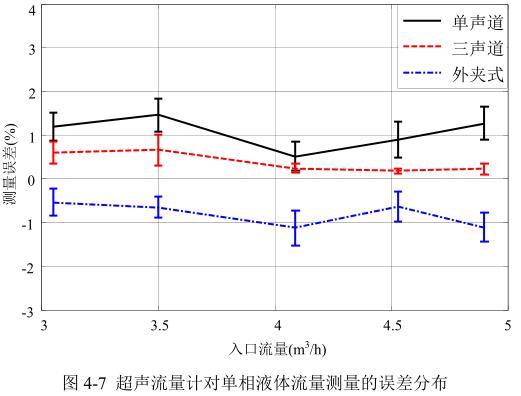 实验中通过检定平台的控制系统对流入管道的液体流量进行调节,由于液体流动的波动性,实验中流量值最终稳定在 3.05m3/h、3.50m3/h、4.09m3/h、4.53m3/h和4.90m3/h。由式(4-2)计算各流量值下三种午夜免费福利对单相液体流量的测量误差如图4-7所示,图中横坐标轴为测量管道入口流速,纵坐标轴为午夜免费福利测量误差,实线表示单声道午夜免费福利的测量误差,虚线表示三声道午夜免费福利测量误差,点画线表示外夹式午夜免费福利测量误差。