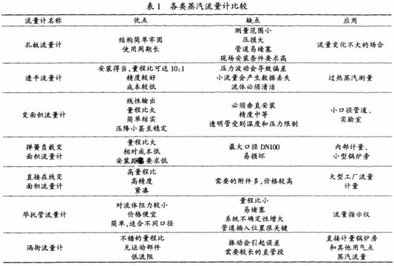 目前在工业上使用的流量计的类型非常多,其中适合蒸汽流量测量的流量计既有其优点,也有使用上的缺点。为确保蒸汽流量计的性能和精度,最重要的是选用的流量计要符合所使用的工况。表1对各类蒸汽流量计的优缺点和应用情况进行了比较。