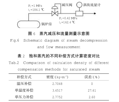 蒸汽减压和流量测量示意图如图6所示。化工厂锅炉出口的饱和蒸汽(1MPa,184.1℃),经过减压阀后转变为过热蒸汽状态(0.42MPa,162.4℃,.密度2.7048kg/m3),不同补偿方式计算的密度对比如表2所示,温度补偿误差高达27.61号,而压力补偿误差仅在2.60号。