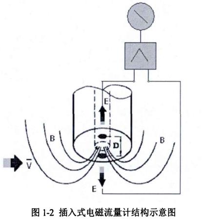 与普通的电磁流量计原理相同,插入式电磁流量计的测量原理同样是基于法拉第电磁感应定律。不同的是,插入式电磁流量计的体积很小,易于安装、拆换。现在市面上的插入式电磁流量计的检测电极多数安装在自身底面,极间距D很小,其结构如图1-2所示。
