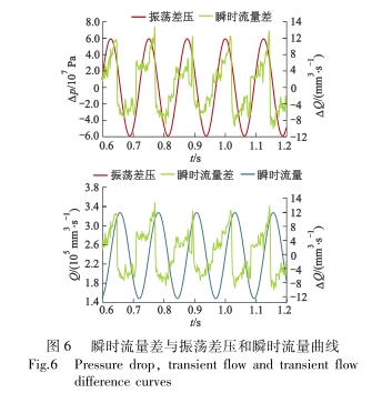 在振荡流态下,成人午夜免费视频前后回流区和旋涡域的大小随人口流速变化不断改变,导致进出口流量存在.瞬时流量差△Q,如图6所示.瞬时流量差表现为复杂的周期性波动,其波动周期与差压振荡周期相同,相位介于瞬时流量和差压两者之间,且稍滞后于振荡差压.当差压增大至峰值点时,瞬时流量差趋向其波峰,并在到达峰值点后反向阶跃.