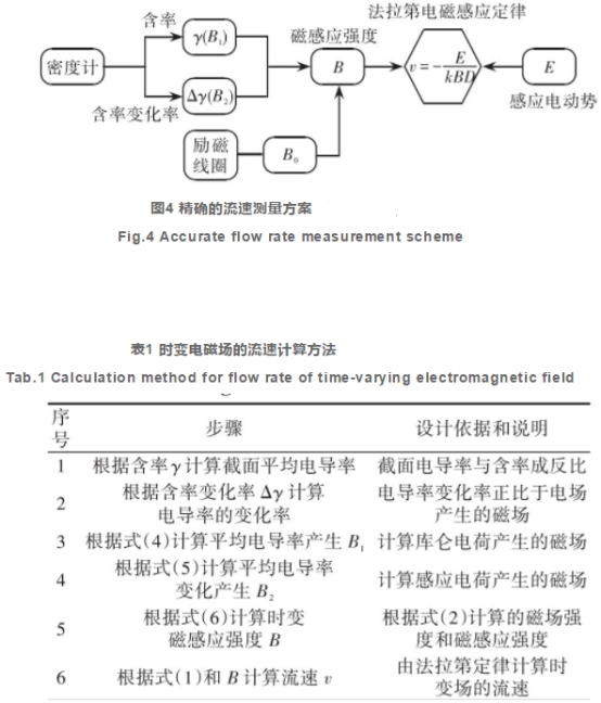 因此,利用射线源密度计或者船上的实际测量装置等测量出含率Y及其变化率△Y,在线估计出瞬时流场中实际存在的时变磁感应强度B,并作为式(3)的输入变量。结合实际测得的感应电动势E,能够有效、准确地计算出时变的磁感应强度进而准确计算出瞬时流速,克服当前电磁流量计只能使用1个事先标定的先验磁场强度导致流速计算的误差。上述方法的实现步骤和实现过程如图4和表1所示。