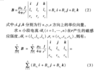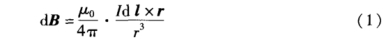 式中:μ0为真空的磁导率;I为电流强度;dI为导线元的长度矢量;r为电流元到P点的径矢;r为电流元到P点的距离。