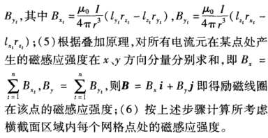 电磁流量计励磁线圈所产生感应磁场分布情况进行数值计算与仿真。以2个励磁线圈几何中心连线为x轴,2个电极所在直线为y轴,测量管中心轴线为z轴,建立空间直角坐标系。在该坐标系下,计算励磁线圈在测量管道内电极横截面上产生的感应磁场,其步骤如下:(1)在x-y平面上测量管道的电极横截面内,对2个线圈之间区域进行网格化,并确定每--网格点对应的坐标值(x,y,0),网格划分越细,区域内磁感应强度计算精度越高;(2)把载流导线划分成微电流元的集合,并确定每一微电流元矢量dl的坐标(lx,ly,lz);(3)计算从每个网格点到电流元的径矢r(rx,ry,rz)及其距离r;(4)在区域内每个网格点处,分别计算第t个电流元产生的磁场强度矢量在x、y方向上的分量Bxt和