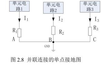 图 2.7 所示为串联单点接地(又称公共接地)示意图。图中所有单元电路的地串联连接在一起。R1、R2、R3 表示线路的阻抗,I1、I2和I3分别是单元电路1、2、3的相应电流。