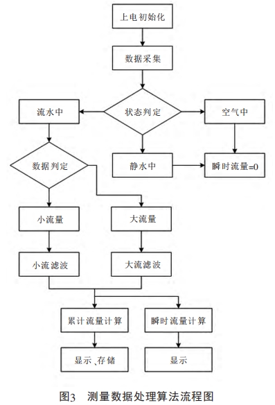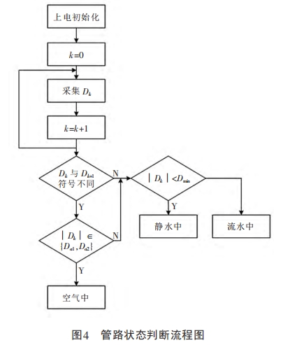 图3所示的流程为测量系统采样数据的处理过程,因此未涉及励磁、通信等功能模块。系统对采集的原始数据进行判断,区分电极处于空气、静水或流水等三种不同状态,如图4所示。