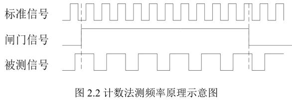 图2.2为计数法测频率的原理图。其中单片机使用一个定时器进行定时用于产生闸门信号。设标准信号频率为fT。假设定时器定时的周期为NT个标准信号时钟脉冲,从而计算出闸门信号的时间为NT/fT。此时单片机的另一个计数器对被测信号进行脉冲计数,假设在闸门信号中所得到的被测信号的计数值为Nx,则可得:
