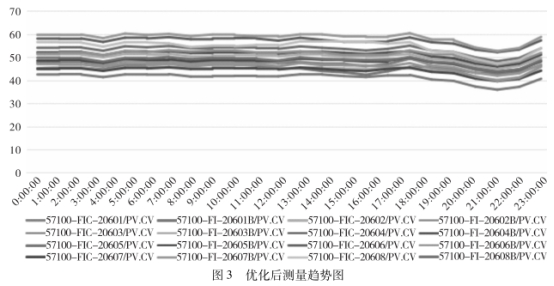 2)优化后加氢精制减压塔加热炉8路进料流量在2017年12月某--天24h的测量折线图如图3所示。