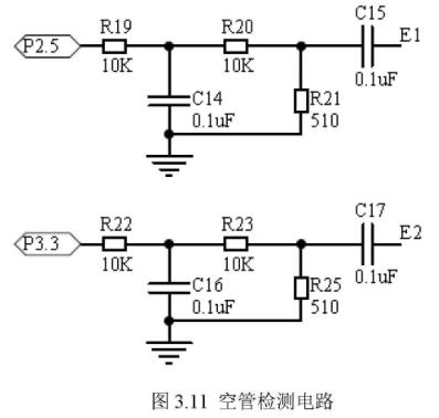 在实际工程测量应用中,很难保证管道始终充满液体,因此实时侦测空管状态并给出报警对电磁流量计的信号处理来说是至关重要的,本系统设计的部分空管检测电路如图3.11所示,在图中E1、E2分别与图3.5中的SIG+、SIG-相连,P2.5与P3.3为单片机的引脚,P6.6为单片机内部的12位A/D输入端。